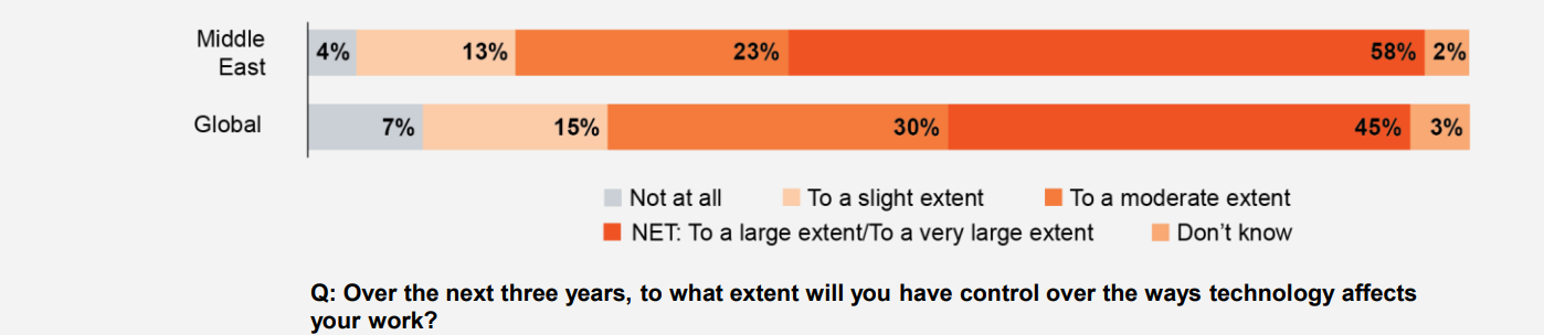 ويعتقد 58% من الموظفين في الشرق الأوسط أنهم يستطيعون التحكم في تأثير الذكاء الاصطناعي على أداء عملهم، بمعنى أنهم قادرين على التعامل معه والتحكم في تأثيره عليهم، مقابل المتوسط العالمي الذي يساوي 45% عالميًا، أي أن هناك فرق بحوالي 13%، ما يعكس جاهزية عالية للتكيف مع هذه التقنيات.
