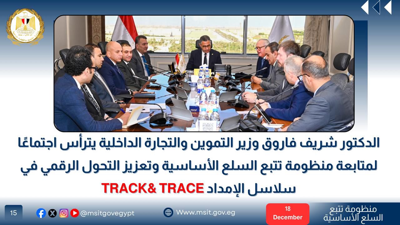 في إطار جهود الوزارة لتعزيز حوكمة منظومة تداول السلع الاستراتيجية، ترأس الدكتور شريف فاروق، اجتماعًا موسعًا لمتابعة ومناقشة منظومة تتبع السلع الأساسية (Track & Trace)، وذلك في ضوء الخطوات التنفيذية الجارية لتطبيق نظم رقمية حديثة تسهم في رفع كفاءة سلاسل الإمداد وضمان وصول السلع للمواطنين.