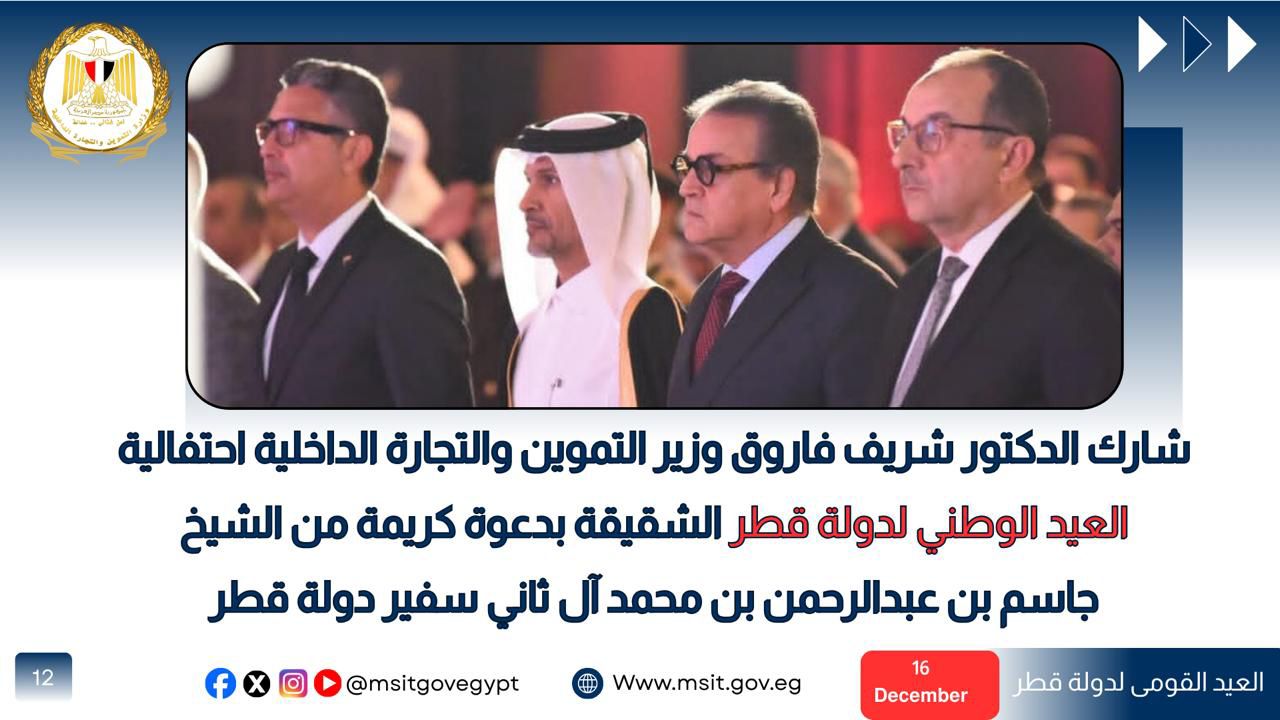 وشارك الدكتور شريف فاروق وزير التموين والتجارة الداخلية احتفالية العيد الوطني لدولة قطر الشقيقة، بدعوة من الشيخ جاسم بن عبدالرحمن بن محمد آل ثاني سفير دولة قطر لدى جمهورية مصر العربية
