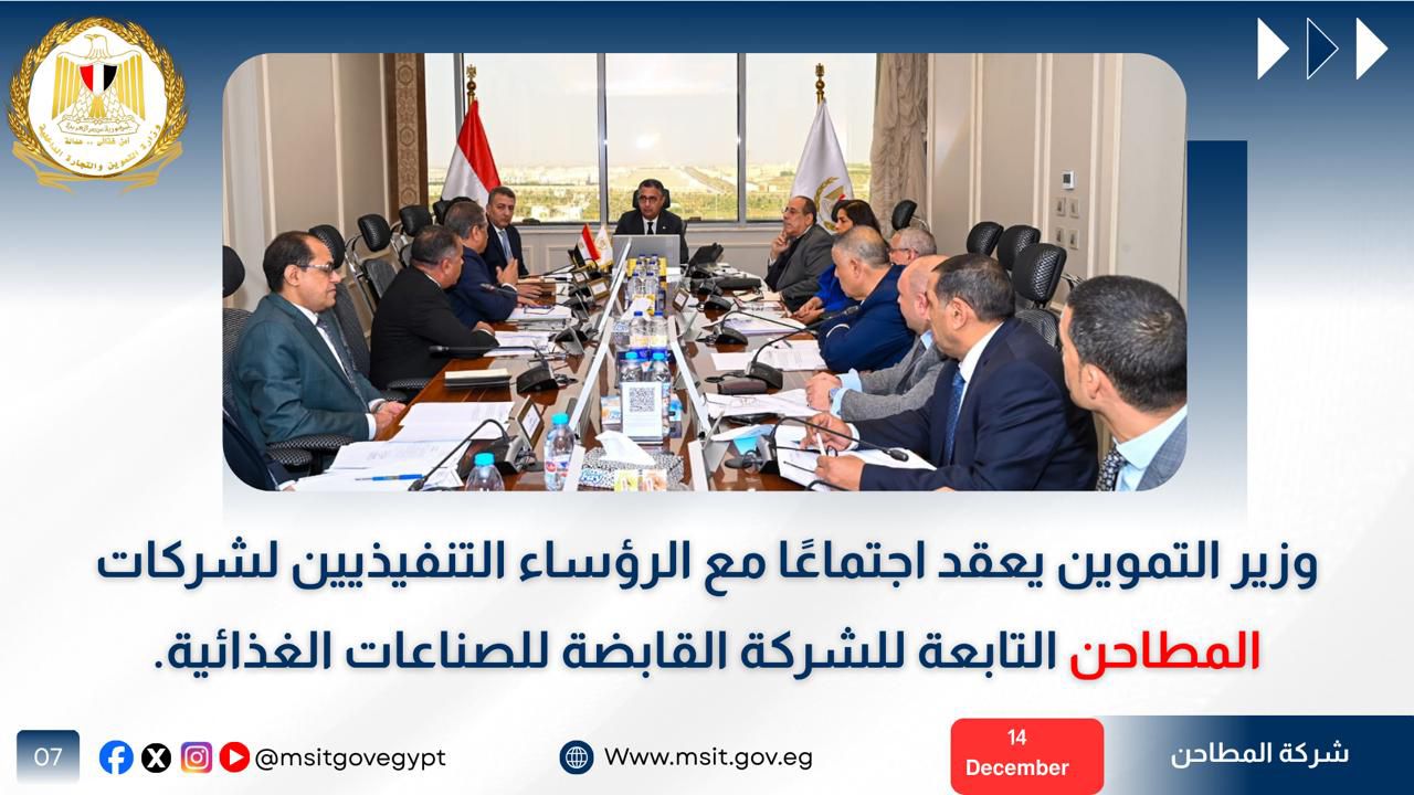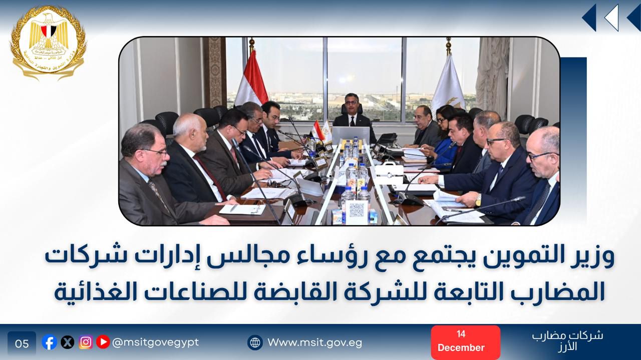 في إطار الاجتماعات الدورية التي عقدها الدكتور شريف فاروق، التقى الوزير رؤساء شركات المضارب التابعة، وشهد الاجتماع استعراض موقف المخزون الحالي، وخطط العمل خلال الفترة المقبلة، إلى جانب مناقشة سبل تطوير منظومة التخزين والنقل، بما يسهم في تقليل الفاقد وتحسين كفاءة التداول.