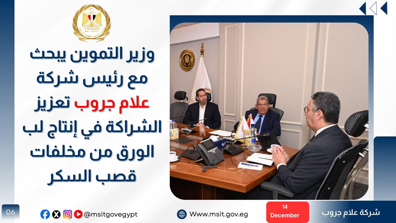 في إطار توجه الدولة لتعزيز الشراكة مع القطاع الخاص ودعم الصناعات الوطنية ذات القيمة المضافة، اجتمع الدكتور شريف فاروق مع رئيس شركة علام جروب، لبحث سبل التعاون المشترك في مجال إنتاج لب الورق اعتمادًا على مخلفات إنتاج مصانع سكر القصب، في إطار رؤية مصر 2030 للتحول نحو الاقتصاد الأخضر وتعزيز مفاهيم الاستدامة البيئية.