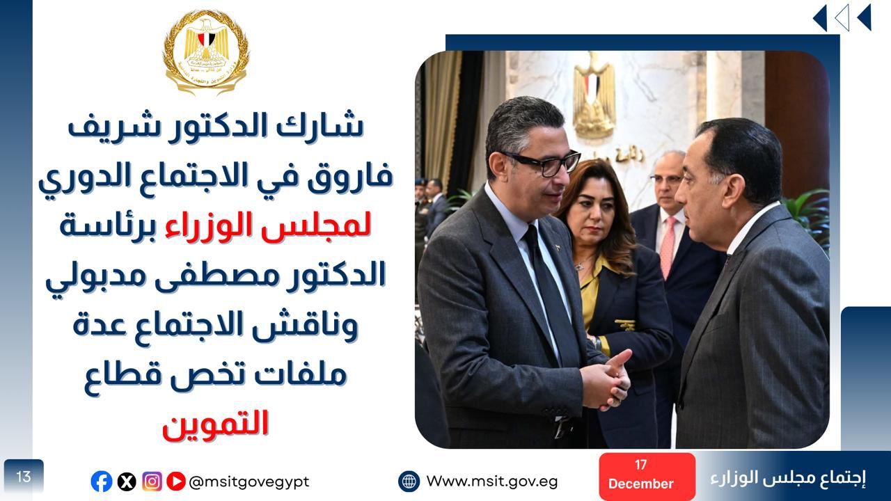 ​شارك الدكتور شريف فاروق في الاجتماع الدوري لمجلس الوزراء برئاسة الدكتور مصطفى مدبولي، وناقش الاجتماع عدة ملفات تخص قطاع التموين: ​حيث عرض الوزير آخر ما توصلت إليه الدراسات بشأن التحول من الدعم العيني إلى الدعم النقدي، وأعلن دولة رئيس الوزراء عقب الاجتماع أن المناقشات التفصيلية والإجراءات التنفيذية ستبدأ الأسبوع المقبل، ​كما قدم الوزير تقريراً حول أرصدة السلع الأساسية (القمح، الزيت، السكر)، مؤكداً أنها آمنة وتكفي لعدة أشهر قادمة.