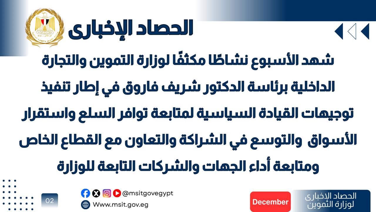 شهد الأسبوع الماضي نشاطًا مكثفًا لوزارة التموين والتجارة الداخلية برئاسة الدكتور شريف فاروق، في إطار تنفيذ توجيهات القيادة السياسية لمتابعة توافر السلع واستقرار الأسواق، والتوسع في الشراكة والتعاون مع القطاع الخاص، ومتابعة أداء الجهات والشركات التابعة للوزارة.