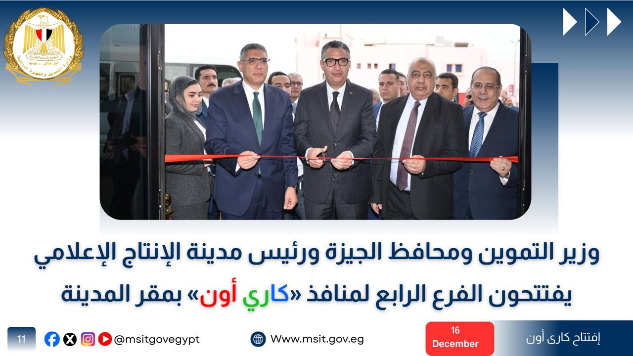 افتتح الدكتور شريف فاروق ومحافظ الجيزة، الفرع الرابع لمنافذ الوزارة «كاري أون»، وذلك بمقر مدينة الإنتاج الإعلامي بمحافظة الجيزة، ويقام الفرع الجديد على مساحة تبلغ نحو 300 متر مربع، ويقدم تجربة تسوق عصرية ومتكاملة للمواطنين، تعتمد على جودة العرض وتنوع السلع وسهولة الحصول على الخدمة.