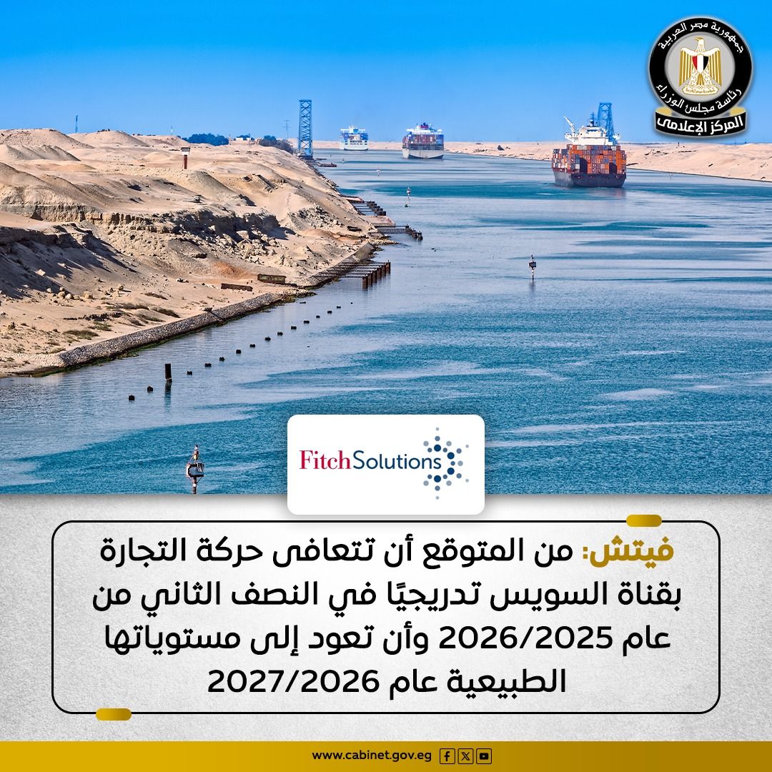 قال المركز الإعلامي لمجلس الوزراء إن وكالة "فيتش" أكدت أن حركة التجارة بقناة السويس ستشهد تعافيًا تدريجيًا في النصف الثاني من عام 2025/2026 بعد وقف إطلاق النار في غزة، وتوقعت عودة حركة السفن بالقناة إلى مستويات ما قبل الحرب خلال عام 2026 /2027.