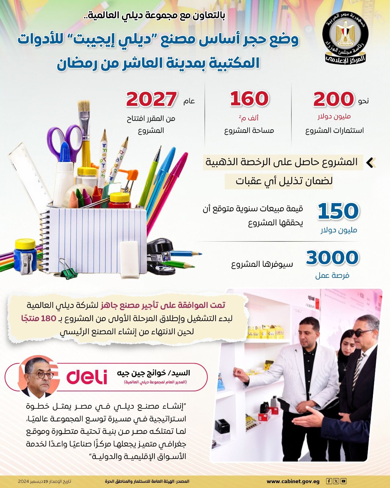 أكد مركز المعلومات ودعم اتخاذ القرار التابع لمجلس الوزراء، أن مصنع "ديلي إيجيبت" يعد خطوة مهمة تعكس الثقة المتزايدة للمستثمرين العالميين في مناخ الاستثمار بمصر وقدرته على استقطاب الصناعات ذات القيمة المضافة العالية، إذ يعد مصنع "ديلي إيجيبت" واحدًا من أكبر مصانع الأدوات المكتبية في المنطقة، مما يعزز قدرات التصنيع المحلي، ويوفر منتجات عالية الجودة للسوق المصري، فضلًا عن دعم التصدير للأسواق العربية والأفريقية والأوروبية.