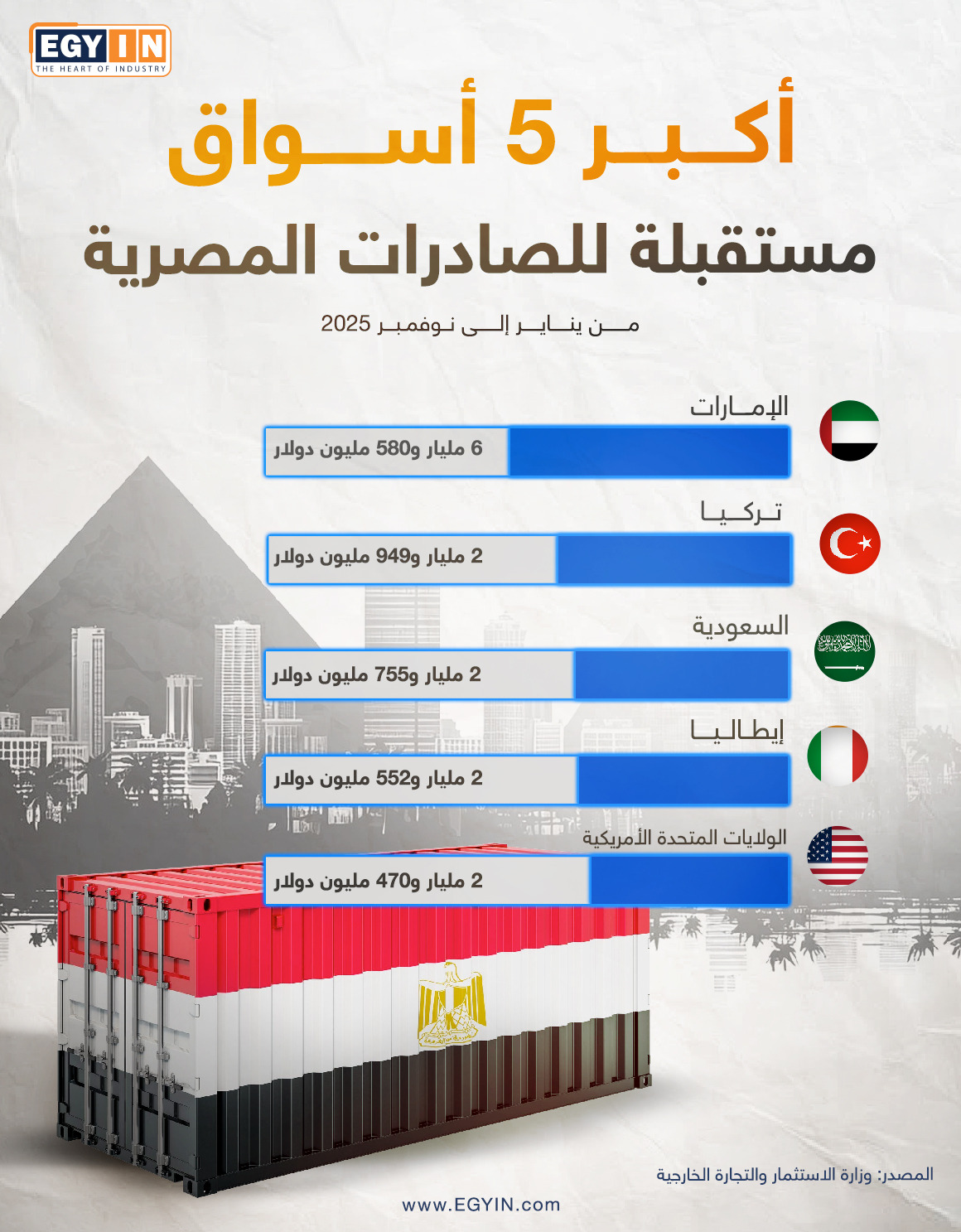 ويستعرض موقع “إيجي إن”، من خلال الإنفوجراف التالي، ترتيب أكبر 5 أسواق مستقبلة للصادرات المصرية خلال الفترة من يناير حتى نوفمبر 2025، وفقًا لبيانات وزارة الاستثمار والتجارة الخارجية، وهي: