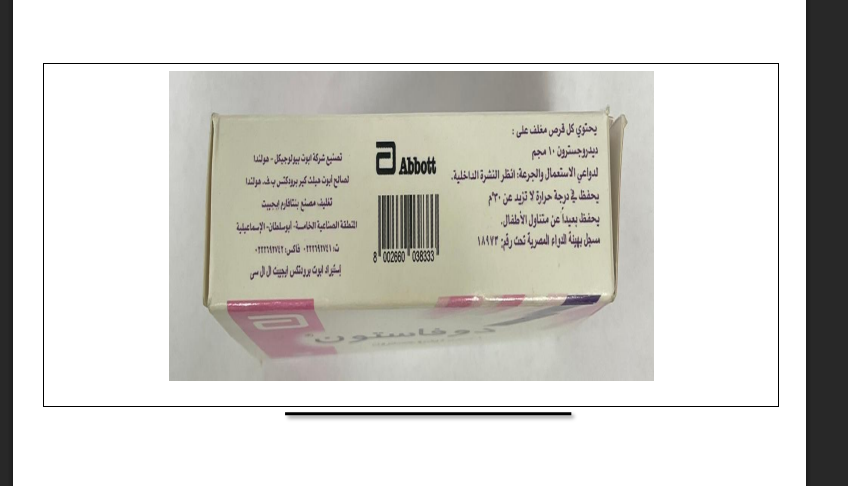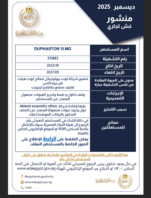 أصدرت هيئة الدواء المصرية، منشورًا يفيد بسحب مستحضر لعلاج اضطرابات الدورة الشهرية، تحت اسم DUPHASTON 10 MG "دوفاستون"، من تصنيع شركة Abbott scientific office “أبوت بيولوجيكال” لصالح أبوت هيلث كير برودكتس تغليف مصنع بنتافارم إيجيبت.
