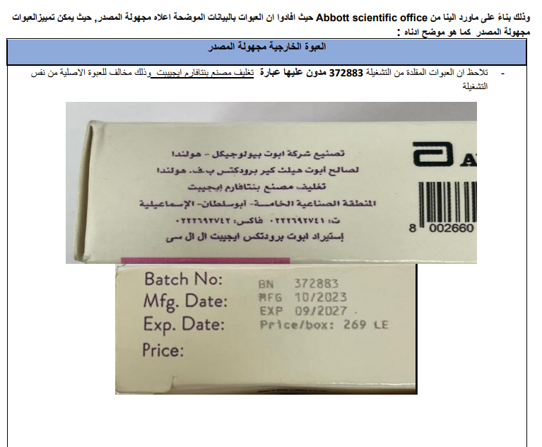 وقالت الهيئة إنه طبقًا لإفادة شركة Abbott scientific office حول وجود عبوات مجهولة المصدر من “دوفاستون” في الأسواق، وآثارها عكسية، سيتم مصادرة وسحب المستحضر من الصيدليات.