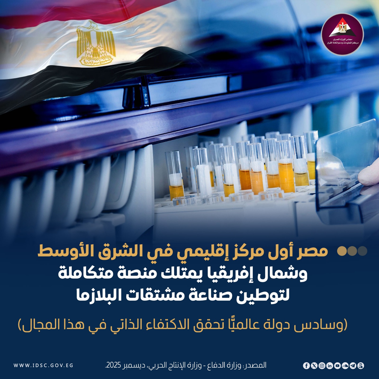 وبدأ التشغيل التجريبي للمرحلة الأولى من مصنع مشتقات البلازما بالعاصمة الإدارية الجديدة، ومن المتوقع بدء التشغيل الفعلي في عام 2026، كما تعد مصر أول مركز إقليمي في الشرق الأوسط وشمال إفريقيا، يمتلك منصة متكاملة لتوطين صناعة مشتقات البلازما، في حين تحتل المركز السادس عالميًا في تحقيق الاكتفاء الذاتي في مجال صناعة تلك المشتقات.