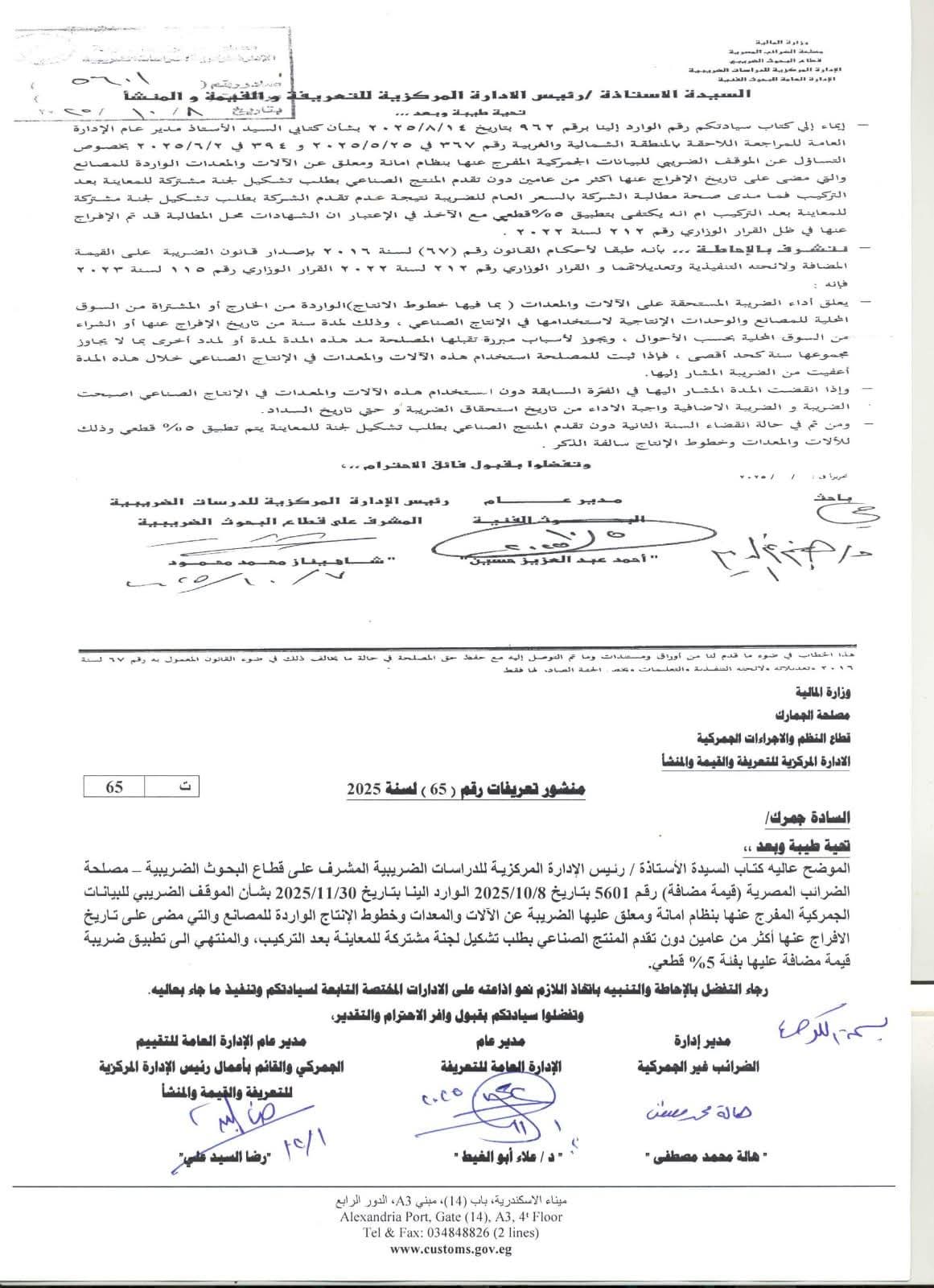 أصدرت مصلحة الجمارك المصرية منشور التعريفات رقم 65 لسنة 2025، لحسم الموقف الضريبي للبيانات الجمركية المفرج عنها بنظام الأمانة والمعلق عليها الضريبة والخاصة بالآلات والمعدات وخطوط الإنتاج الواردة للمصانع.