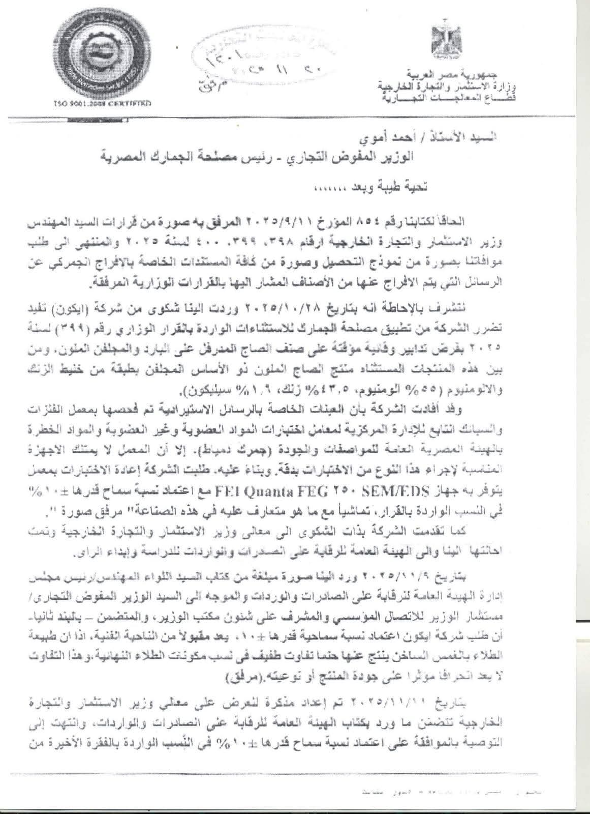 وأوضحت الشركة أن العينات الخاصة بالرسائل الاستيرادية خضعت للفحص بمعمل الفلزات والسبائك التابع للهيئة المصرية العامة للمواصفات والجودة بميناء دمياط، إلا أن المعمل لا يمتلك الأجهزة اللازمة لإجراء هذا النوع من الاختبارات بدقة، ما استدعى المطالبة بإعادة الاختبارات بمعمل متخصص مزود بجهاز FEI Quanta FEG 250 SEM-EDS، مع اعتماد نسبة سماح تتماشى مع طبيعة الصناعة.