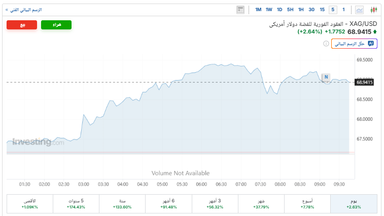 افتتحت الفضة جلسة تداولات الأسبوع على ارتفاع بنسبة 2.6%، متخطية حاجز الـ 68 دولار، مسجلة الآن 68.94 دولار للأوقية، بعد أن افتتحت التداولات عند المستوى 67.16 دولار للأوقية، وفقًا لـ«إنفستينج».