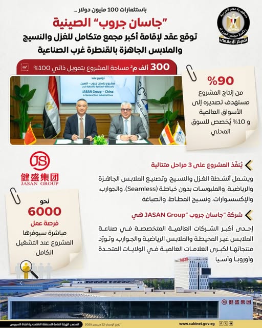 يمثل المشروع الجديد لشركة "جاسان جروب" الصينية إضافة نوعية في قطاع الغزل والنسيج المصري، إذ تمتلك الشركة سلسلة إنتاج متكاملة تمنحها قدرة تنافسية عالية من حيث الجودة والإنتاج.