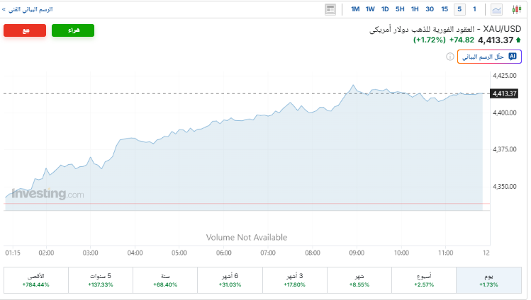 وعلى الصعيد العالمي، صعدت أونصة الذهب العالمي بنحو 1.7%، لتتداول الآن عند المستوى 4,413 دولار للأونصة، بعدما افتتحت تداولات اليوم عند المستوى 4338 دولار للأونصة، محققة أعلى مستوى على مدار اليوم عند 4420 دولار للأوقية، وأدنى مستوى عند 4338 دولار، وفقاً لـ "انفستينج".