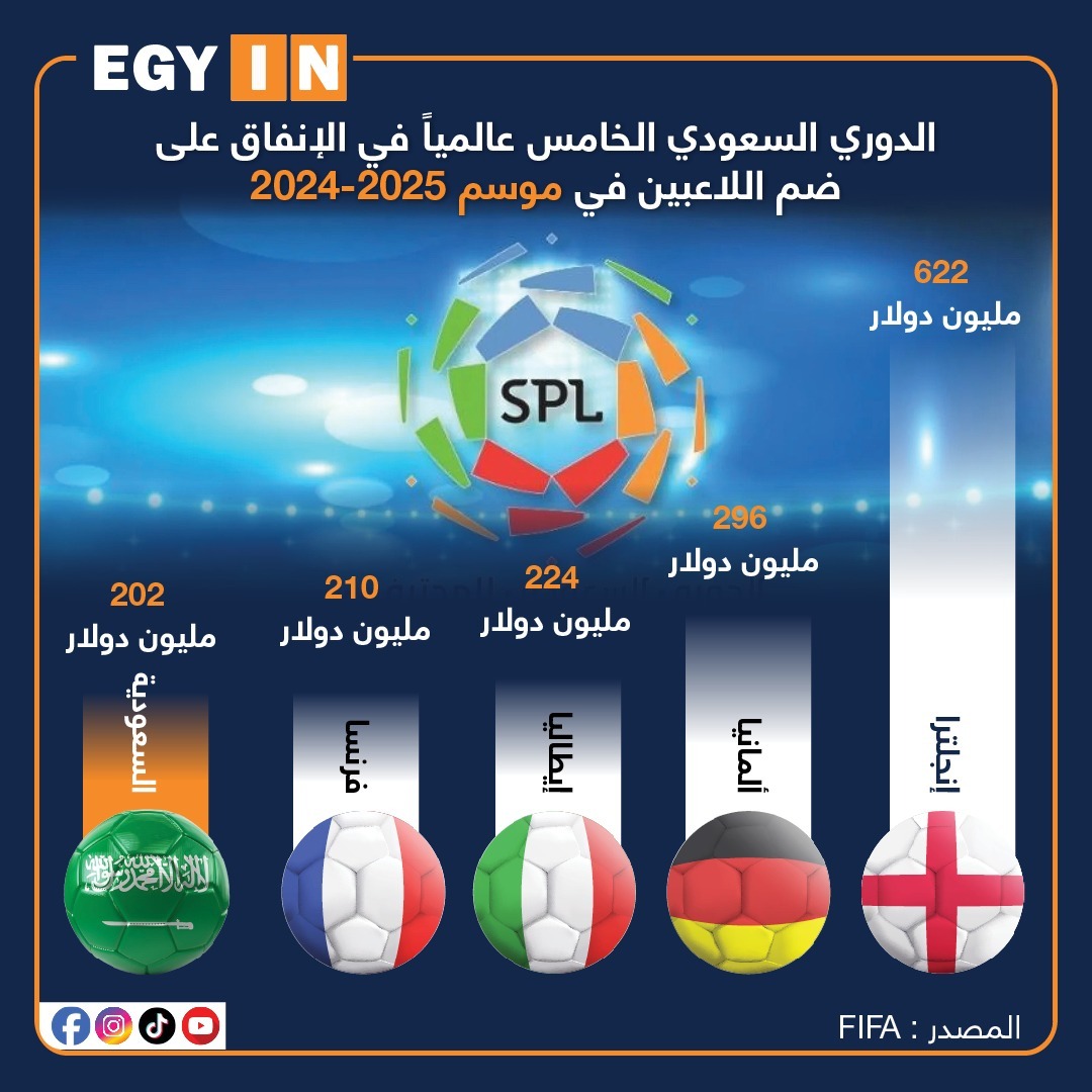 ولعب الدوري السعودي دوراً كبيراً في نمو الإنفاق على ضم اللاعبين في الموسم الحالي عالمياً، إذ لم ينفق في موسم 2023- 2024 سوى 45 مليون يورو، ليتضاعف الإنفاق في الموسم الحالي مقارنة بالموسم السابق بأكثر من 21 مرة.