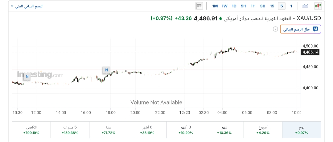وصعدت الأسعار الفورية للذهب بنسبة 0.9%، لتقترب من حاجز 4500 دولار، لتتداول حاليًا عند 4,486 دولار للأوقية، بعدما افتتحت التداولات عند 4,443 دولار، مسجلة أعلى مستوى لها عند 4,497 دولار، وأدنى مستوى عند 4,443 دولار، بحسب تقرير موقع «إنفيستينج».