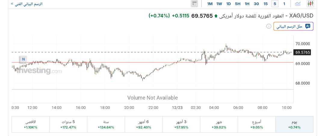 افتتحت الفضة جلسة تداولات اليوم على ارتفاع بنسبة 0.7%، متخطية حاجز الـ 70 دولار في افتتاح الجلسة، ومسجلة الآن 69.75 دولار للأوقية، بعد أن افتتحت التداولات عند المستوى 69.06 دولار للأوقية، مسجلة أعلى مستوى عند 70.05 دولار، وفقًا لـ«إنفستينج».