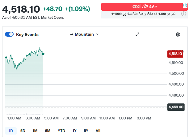 وسجلت عقود الذهب الآجلة تسليم فبراير ارتفاعًا ملحوظًا بنسبة 1.09%، ليتخطى لأول مرة في تاريخه حاجز الـ 4500 دولار، لتسجل الآن نحو 4,518 دولار للأوقية، بعدما افتتحت تداولات اليوم عند المستوى 4,481 دولارًا للأوقية، مسجلة أعلى مستوى عند 4530 دولار، وأدنى مستوى عند 4,479 دولار للأوقية، وفقًا لـ«ياهو فايننس».