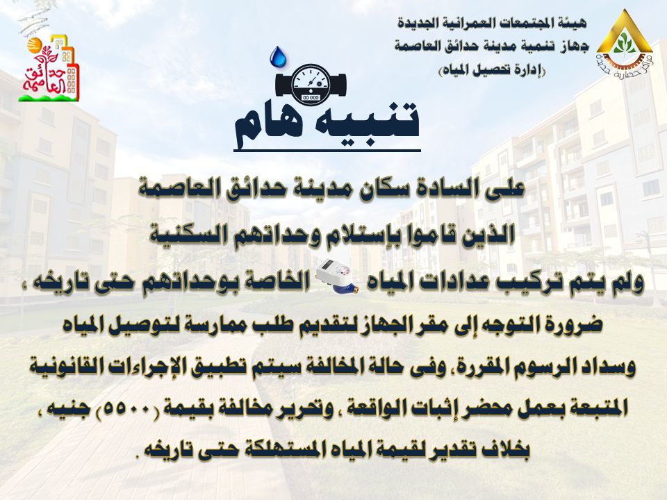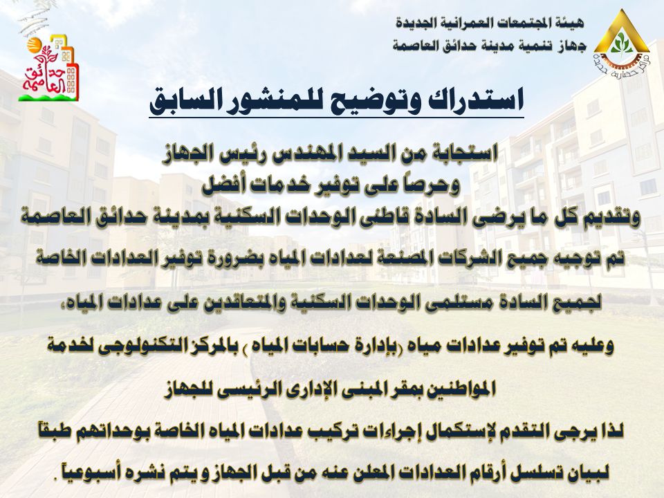 وبعد تحذر الجهاز للسكان، أصدر الجهاز منشورًا جديدًا أكد خلاله أنه استجابة من المهندس رئيس الجهاز وحرصًا على توفير خدمات أفضل، وتقديم كل ما يرضى قاطني الوحدات السكنية بمدينة حدائق العاصمة، تم توجيه جميع الشركات المصنعة لعدادات المياه بضرورة توفير العدادات الخاصة لجميع مستلمي الوحدات السكنية والمتعاقدين على عدادات المياه.