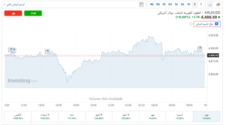 الذهب يتخطى 4500 دولار لأول مرة اليوم الأربعاء 24 ديسمبر 2025