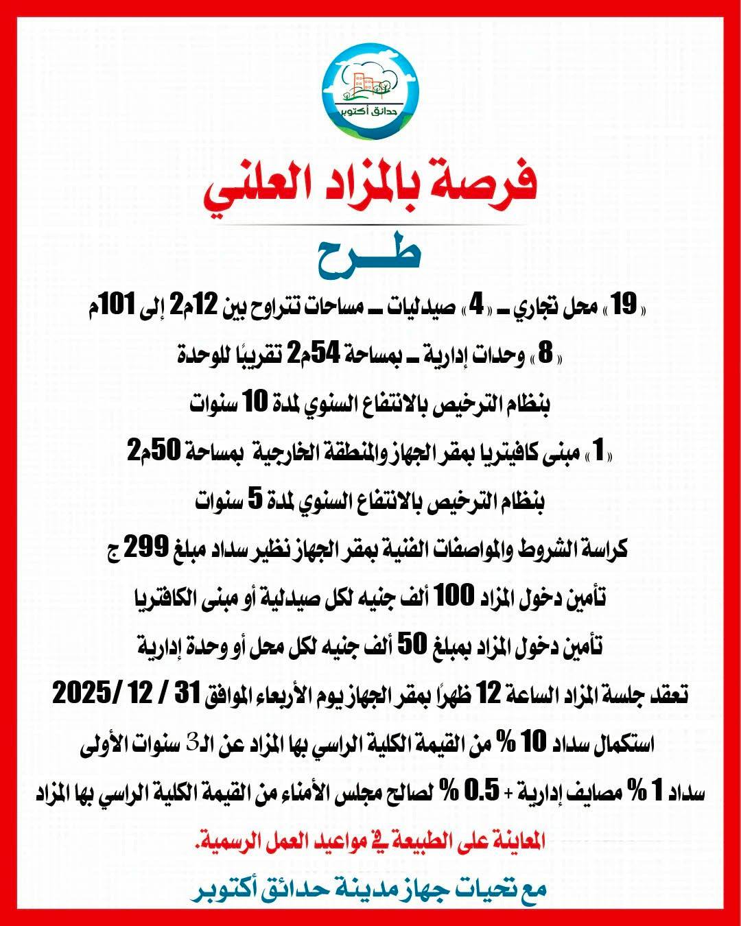 أعلن جهاز مدينة حدائق أكتوبر عن طرح (19) محل تجاري و(4) صيدليات بمساحات تتراوح بين 12م2 إلى 101م2 ووحدات إدارية بمساحة 54م2 تقريبًا للوحدة، بالأسواق التجارية وأسفل العمارات بأماكن متفرقة بالمدينة؛ وذلك بنظام الترخيص بالانتفاع السنوي لمدة 10 سنوات بالمدينة بالمزاد العلني.