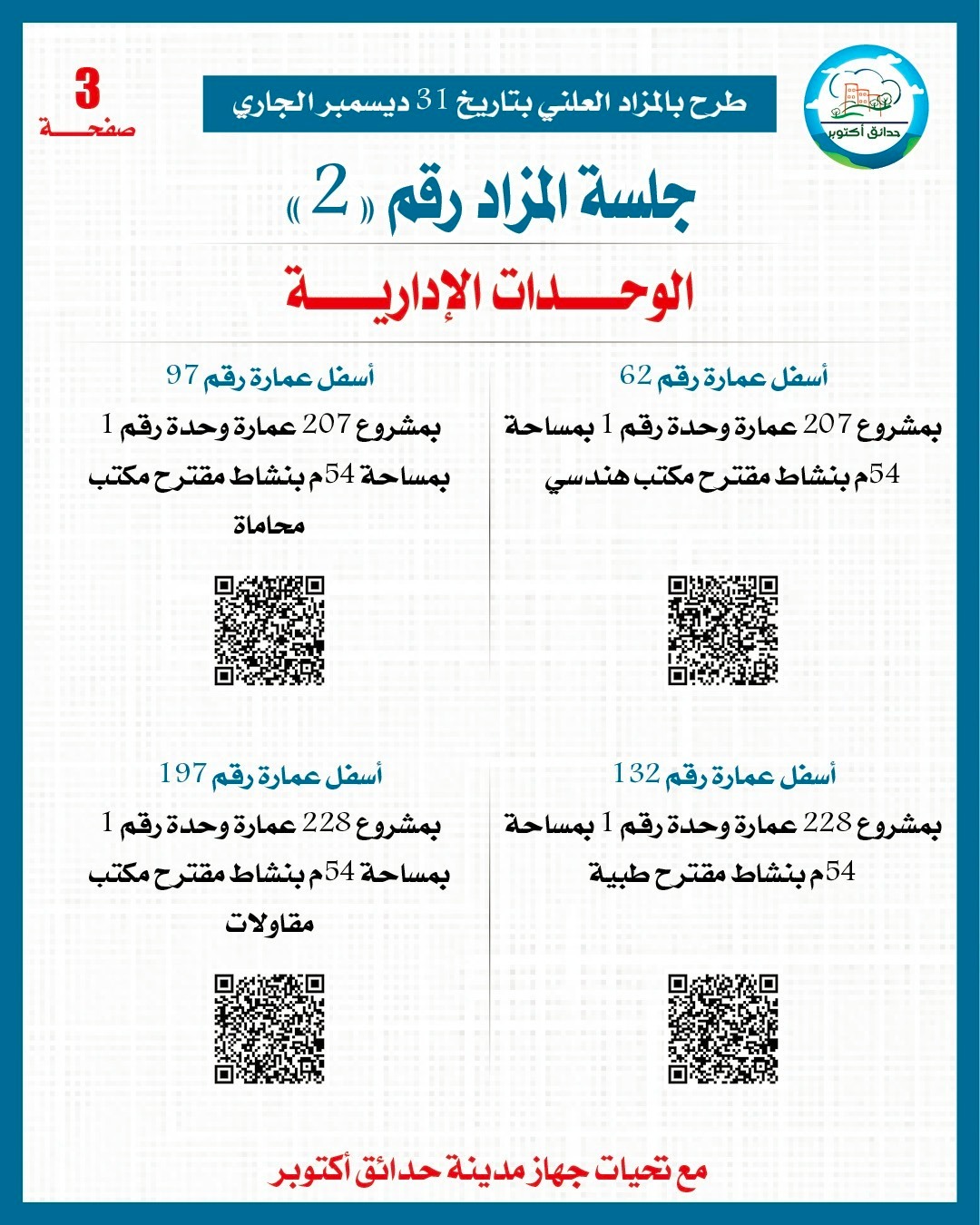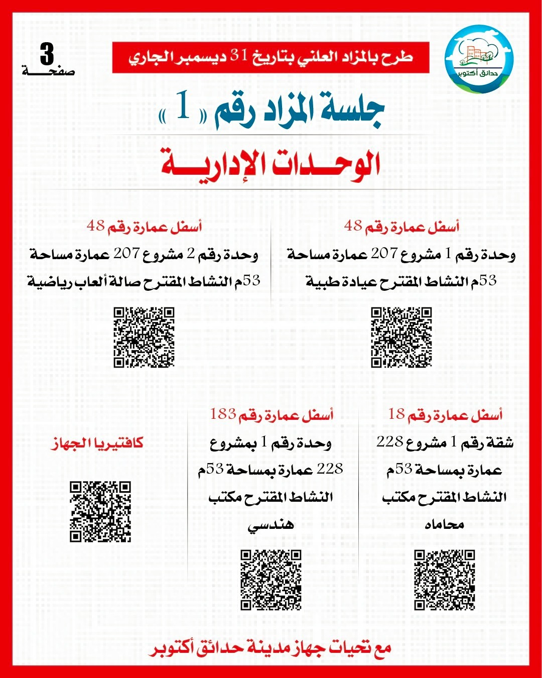 وأشار المهندس ياسر عبد الحليم رئيس جهاز المدينة إلى أنه تعقد جلسة المزاد الساعة الـ12 ظهرًا بمقر الجهاز يوم الأربعاء الموافق 31 / 12 /2025، ويتم استكمال سداد 10% من القيمة الكلية الراسي بها المزاد عن الـ3 سنوات الأولى كتأمين نهائي ساري طوال مدة العقد مع مراعاة تجديد التأمين قبل بداية المدة المتبقية من العقد، وسداد نسبة 1% مصايف إدارية + 0.5% لصالح مجلس الأمناء من القيمة الكلية الراسي بها المزاد وذلك فور رسو المزاد.