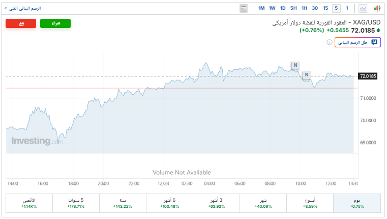 ارتفع سعر الفضة خلال تعاملات اليوم الأربعاء 24 ديسمبر 2025، مدعومًا بالصعود العالمي في سعر الأونصة، والتي تخطت حاجز الـ72 دولارا للأوقية للمرة الأولى لتتداول عند المستوى 72.02 دولار للأوقية، بعد أن افتتحت التداولات عند المستوى 71.47 دولار للأوقية.