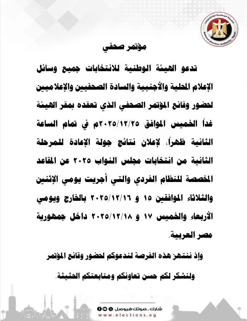 تدعو الهيئة الوطنية للانتخابات، جميع وسائل الإعلام المحلية والأجنبية، والصحفيين والإعلاميين، حضور وقائع المؤتمر الصحفي الذي تعقده بمقر الهيئة غدا الخميس، 25 ديسمبر، في تمام الساعة الثانية ظهراً، لإعلان نتائج جولة الإعادة للمرحلة الثانية من انتخابات مجلس النواب 2025، عن المقاعد المخصصة للنظام الفردي والتي أجريت يومي الإثنين والثلاثاء الموافقين 15 و2025/12/16 بالخارج ويومي الأربعاء والخميس 17 و2025/12/18 داخل جمهورية مصر العربية.