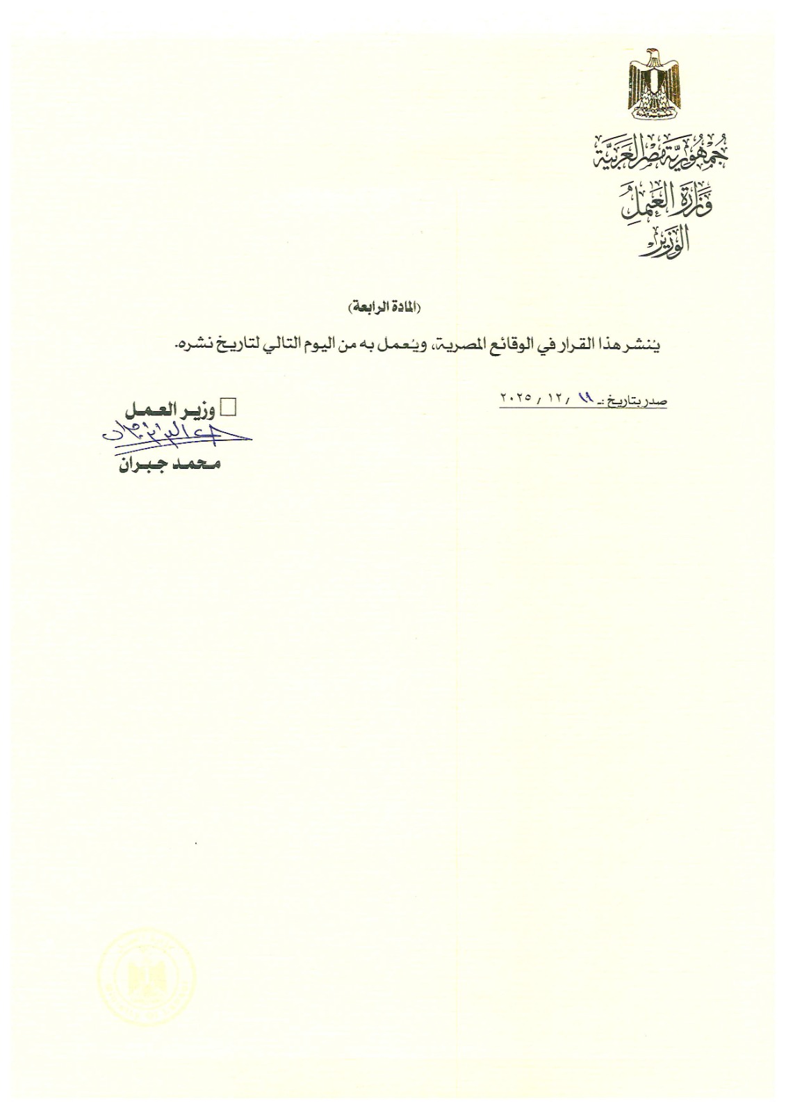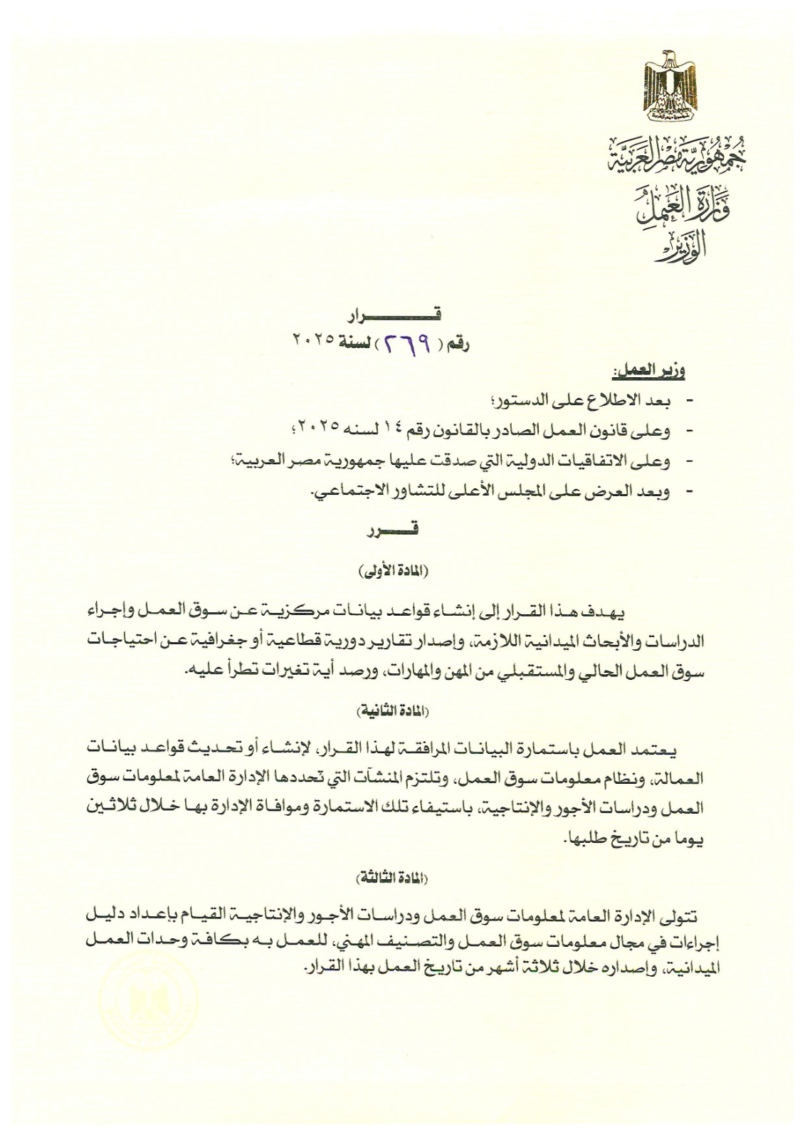 وأصدر وزير العمل محمد جبران القرار الوزاري رقم (269) لسنة 2025، بشأن إنشاء وتحديث قواعد بيانات سوق العمل، بعد الاطلاع على الدستور، وقانون العمل رقم 14 لسنة 2025، والاتفاقيات الدولية ذات الصلة، وبعد العرض على المجلس الأعلى للتشاور الاجتماعي.