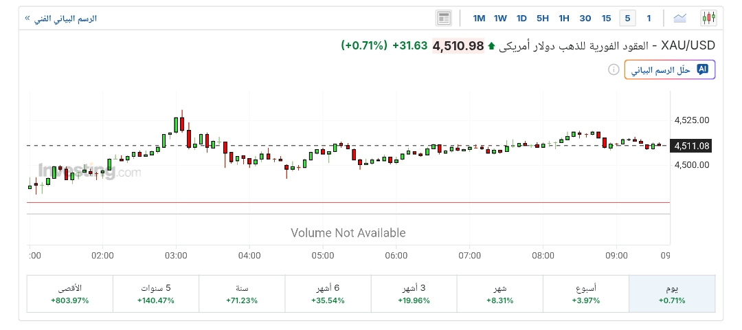 وافتتحت أونصة الذهب العالمي جلسة تداولات اليوم على ارتفاع ملحوظ بنسبة 0.7%، لتتداول حاليًا عند 4,510 دولارات للأوقية، بعد أن افتتحت التعاملات عند المستوى 4,479 دولارًا للأوقية، بحسب موقع «إنفيستينج».
