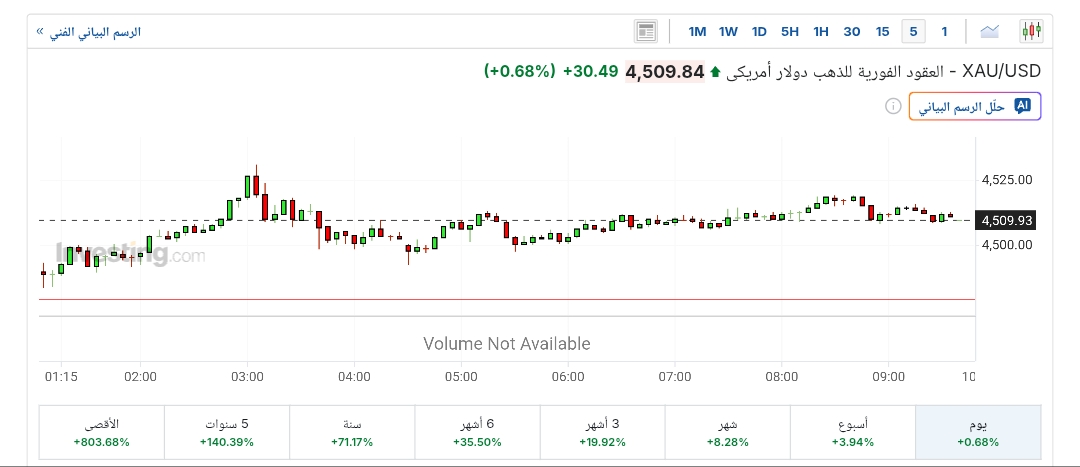 وصعدت الأسعار الفورية للذهب بنسبة 0.6%، لتتداول حاليًا عند 4,509 دولارات للأوقية، بعدما افتتحت التداولات عند 4,479 دولارًا، مسجلة أعلى مستوى لها عند 4,531 دولارًا، وأدنى مستوى عند 4,479 دولارًا، بحسب تقرير موقع «إنفيستينج».