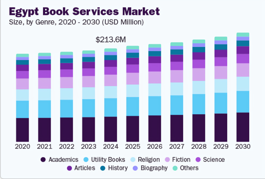 بلغت قيمة سوق خدمات الكتب في مصر نحو 213.6 مليون دولار أمريكي خلال عام 2024، ومن المتوقع أن يسجل معدل نمو سنوي مركب يقدر بـ 2.6% خلال الفترة من 2025 إلى 2030، وعلى الرغم من أن هذا المعدل لا يصنف ضمن معدلات النمو المرتفعة، إلا أنه يعكس حالة من المرونة والاستقرار النسبي في سوق يتعرض لضغوط اقتصادية مستمرة.