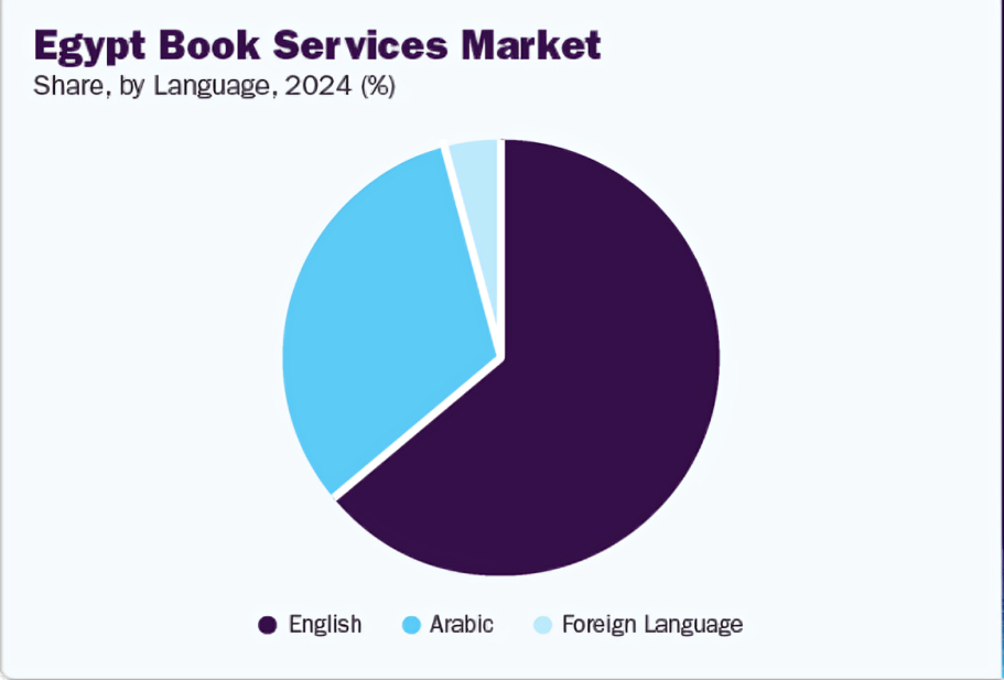 من حيث اللغة، تصدرت الكتب باللغة الإنجليزية سوق خدمات الكتب في مصر من حيث الإيرادات خلال عام 2024، ويعكس ذلك تنامي أهمية اللغة الإنجليزية في التعليم الجامعي، وسوق العمل، والهجرة، إلى جانب انتشار المدارس والجامعات التي تعتمد الإنجليزية كلغة أساسية للتدريس.