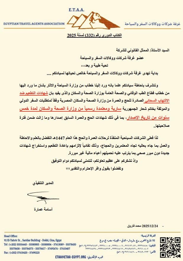 وأصدرت غرفة شركات ووكالات السفر والسياحة، منشورًا يحمل الرقم 332 لسنة 2025، نص على مخاطبة قطاع الطب الوقائي والصحة العامة بوزارة الصحة والسكان، يفيد بأن شهادات التطعيم ضد الالتهاب السحائي الصادرة للحج والعمرة من الوزارة، يأتي وفقًا لمتطلبات السفر الدولي والموثقة بخاتم شعار الجمهورية، ساريةً ومعتمدةً رسميًا من الوزارة لمدة خمس سنوات من تاريخ الإصدار، بما في ذلك شهادات الحج والعمرة السابق إصدارها، والتي ما زالت ضمن فترة صلاحيتها.
