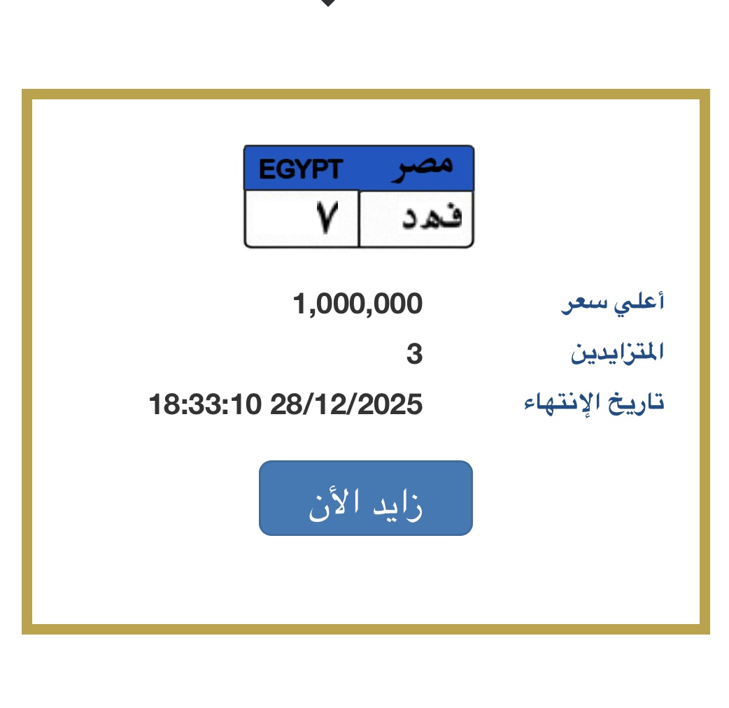 شهد مزاد اللوحات المعدنية المميزة، الذي تنظمه وزارة الداخلية عبر بوابة المرور الإلكترونية، طرح لوحة معدنية تحمل رقم «ف هـ د 7»، بسعر افتتاحي بلغ مليون جنيه، ما جعلها واحدة من أبرز اللوحات المطروحة حاليًا على المنصة.