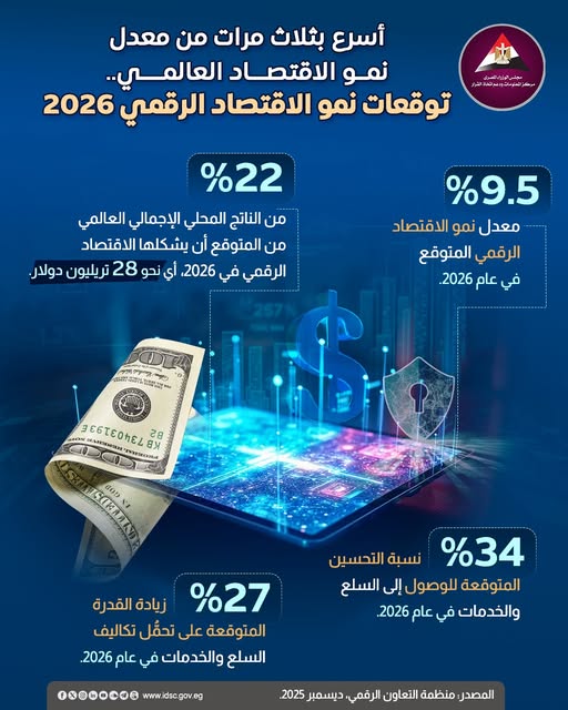 نشر مركز المعلومات ودعم اتخاذ القرار بمجلس الوزراء، تقريرًا عبر صفحته الرسمية على مواقع التواصل الاجتماعي" فيسبوك"، يشير إلى توقعات نمو الاقتصاد الرقمي 2026، موضحًا أن معدل الاقتصاد في العام الجديد، سيكون أسرع بثلاث مرات من معدل نمو الاقتصاد العالمي، متوقعًا أن يبلغ معدل النمو في 2026 حوالي 9.5%، مع مساهمته بحوالي 22% من الناتج المحلي الإجمالي العالمي.