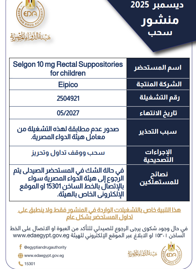 أصدرت هيئة الدواء المصرية، منشورًا، يفيد بسحب مستحضر لعلاج السعال، تحت اسم Selgon 10 mg Rectal Suppositories for Children "سيلجون"، من إنتاج شركة Eipico “إيبكو”، ويستخدم هذا الدواء لعلاج السعال المهيج والتشنجي.