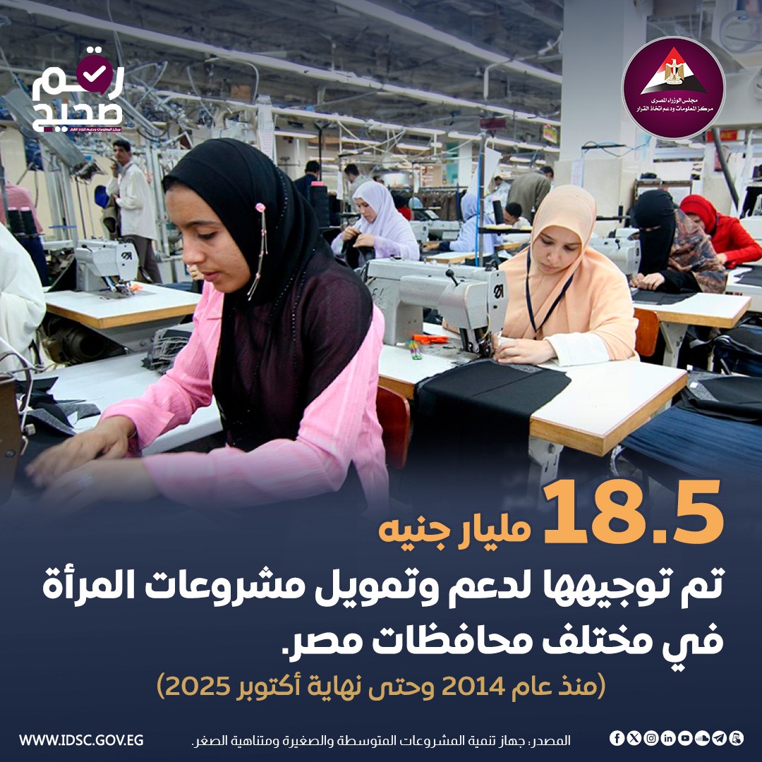 أكد مركز المعلومات ودعم اتخاذ القرار التابع لمجلس الوزراء، أن جهاز تنمية المشروعات المتوسطة والصغيرة ومتناهية الصغر عن نجح في توفير تمويل بقيمة 18.5 مليار جنيه لدعم مشروعات المرأة بجميع محافظات الجمهورية، وذلك خلال الفترة من عام 2014 وحتى نهاية أكتوبر 2025.