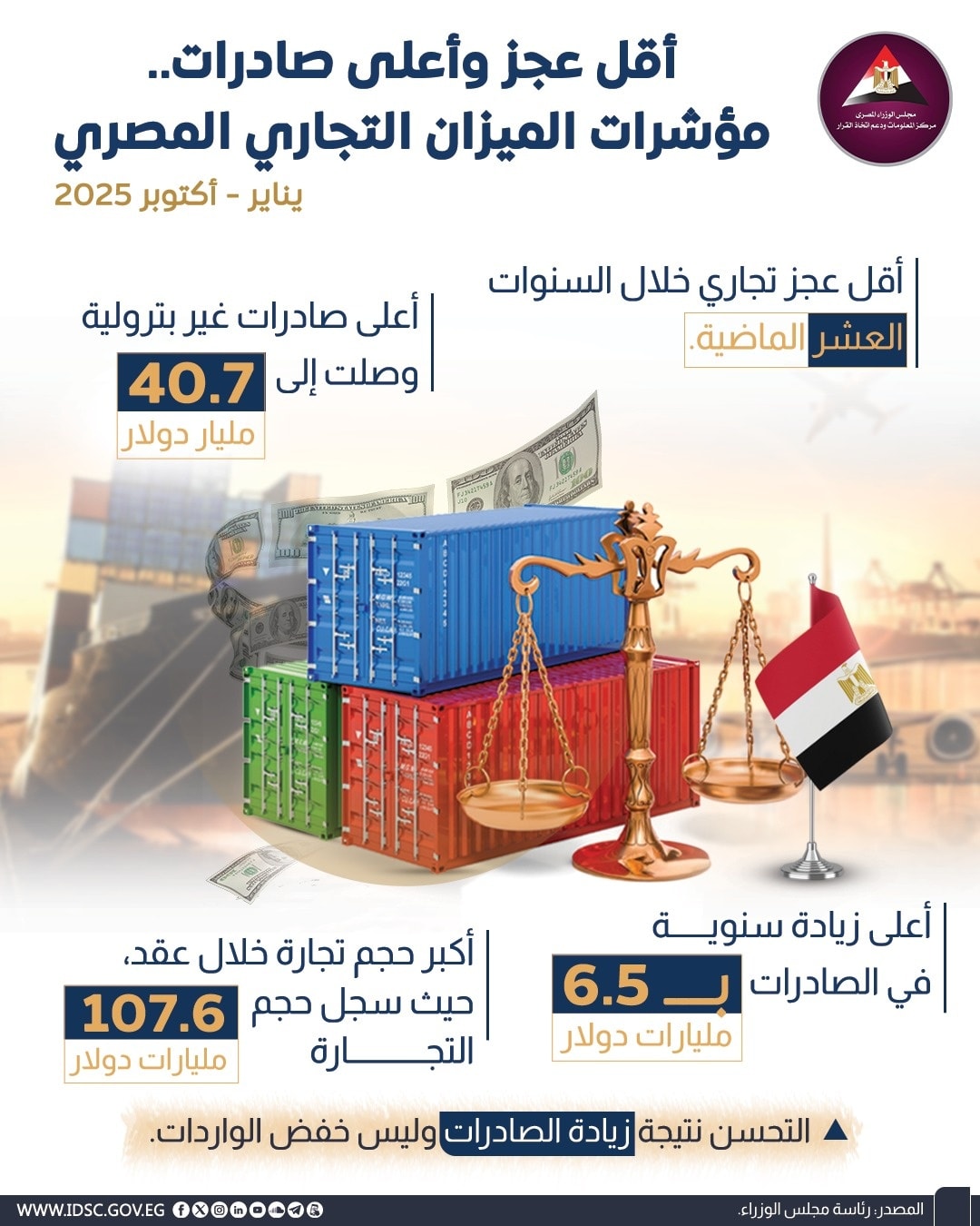 أكد مركز المعلومات ودعم اتخاذ القرار التابع لمجلس الوزراء، أن مؤشرات الميزان التجاري المصري سجل أقل عجز خلال السنوات العشر الأخيرة، وأعلى صادرات غير بترولية، مشيرًا إلى أن التحسن نتيجة زيادة الصادرات وليس خفض الواردات.