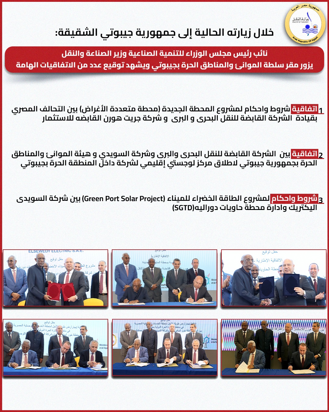 استعرضت وزارة النقل عددا من الاتفاقيات التجارية الهامة التي وقعتها الدولة المصرية مع دولة جيبوتي في إطار الشراكة الاستراتيجية بين الجانبين.