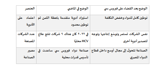 - دور هذه الصناعة، توسع ليشمل تصدير منتجات دوائية أخرى خارج نطاق فيروس سي، مستفيدة من الخبرات التي بنتها خلال سنوات برنامج القضاء على المرض.
