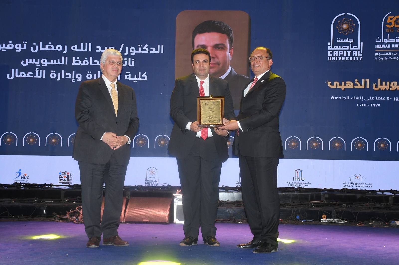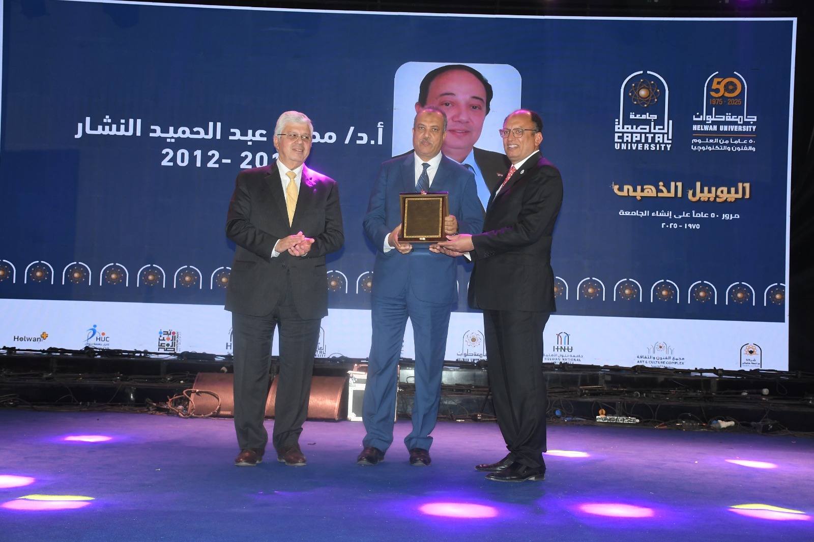 شهد الدكتور أيمن عاشور وزير التعليم العالي والبحث العلمي، ومحمد عبداللطيف وزير التربية والتعليم والتعليم الفني، احتفالية اليوبيل الذهبي لجامعة العاصمة (حلوان سابقًا)، والتي نظمتها الجامعة بمناسبة مرور 50 عامًا على تأسيسها، وذلك بمجمع الفنون والثقافة، وبحضور عدد من القيادات التنفيذية والأكاديمية والشخصيات العامة والطلاب.