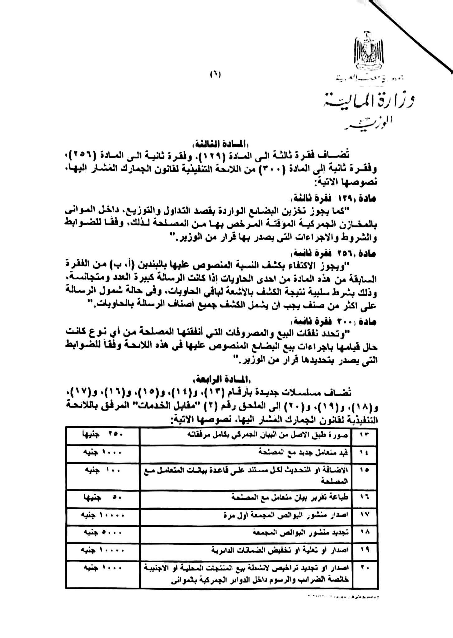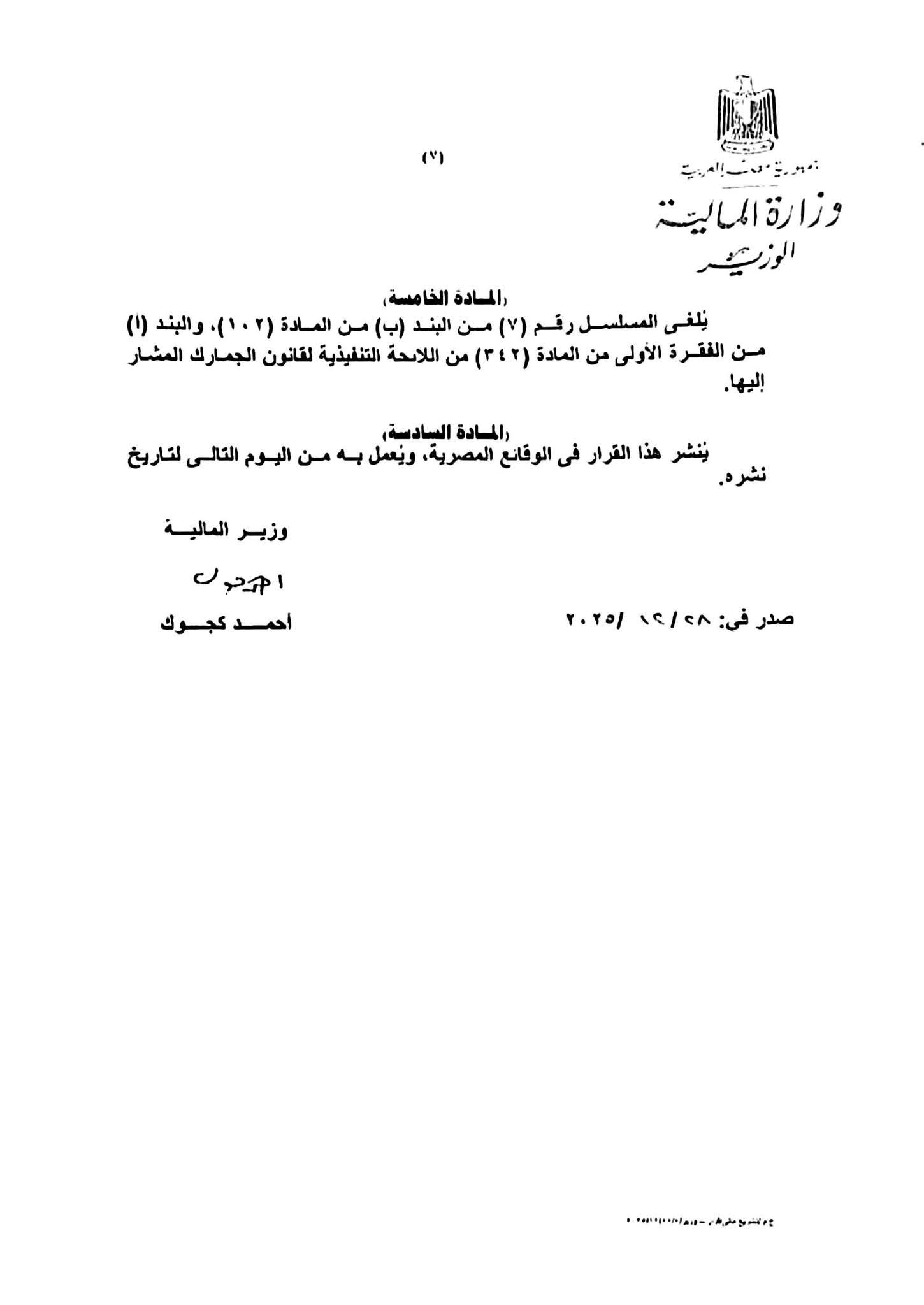 يلغى المسلسل رقم (۷) من البند (ب) من المادة (102)، والبند (أ) من الفقرة الأولى من المادة (342) من اللائحة التنفيذية لقانون الجمارك المشار إليها، وتنص المادة السادسة، على أن ينشر هذا القرار في الوقائع المصرية، ويعمل به من اليوم التالي لتاريخ لنشره.