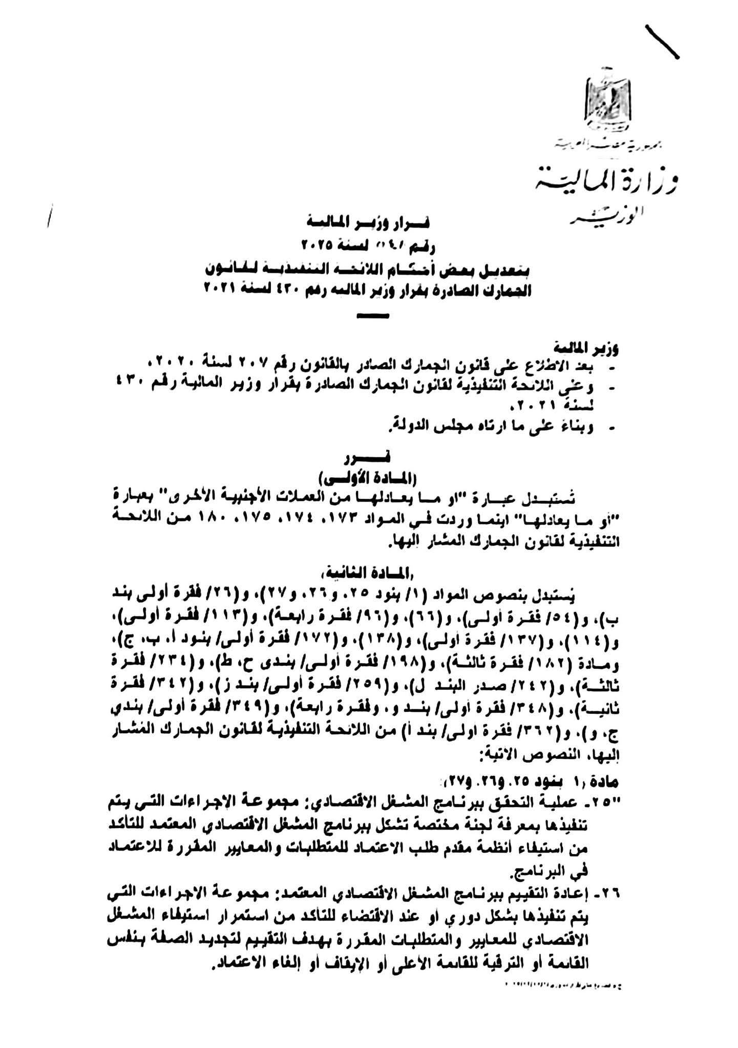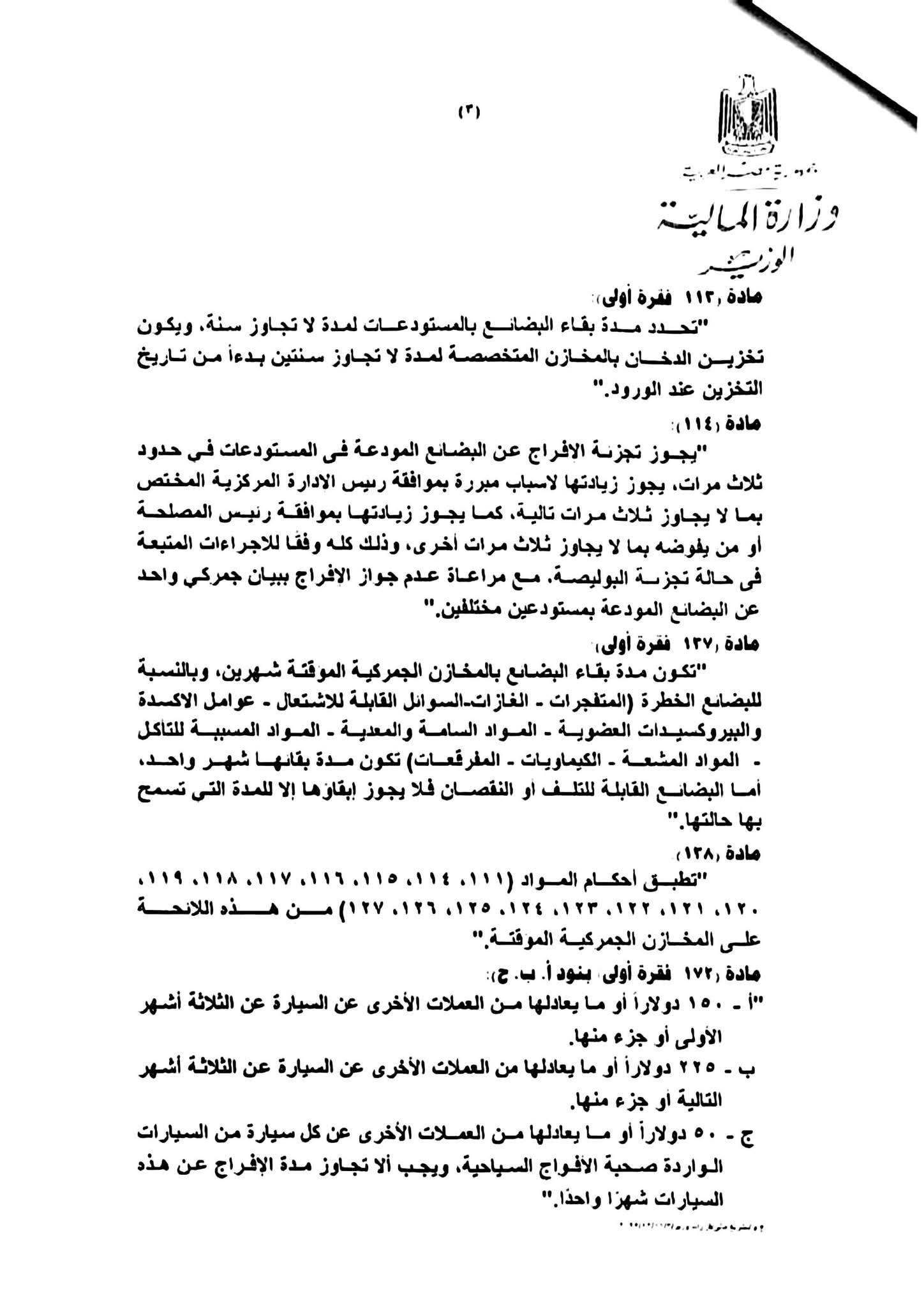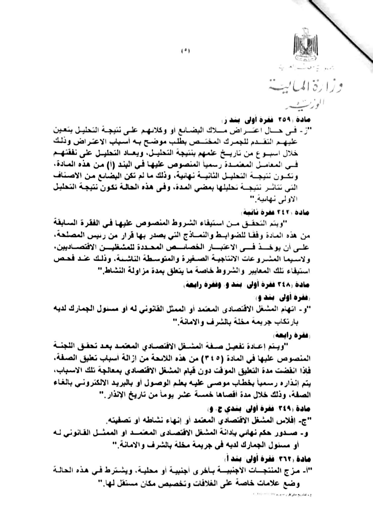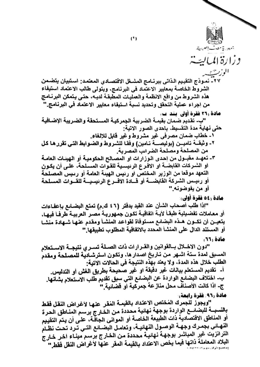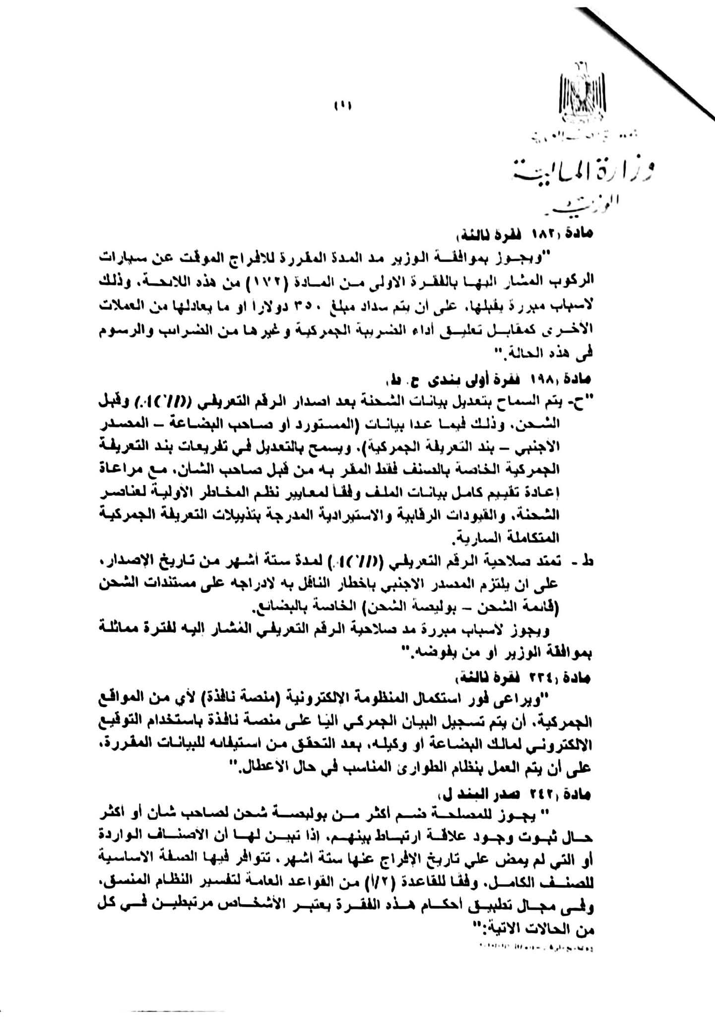 ونصت المادة الثانية من القرار، على أن يستبدل بنصوص المواد (1/ بنود 25 و 26 ، و (27)، و (26/ فقرة أولى بند ب)، و (54/ فقرة أولى)، و (66) ، و ( 96 / فقرة رابعة)، و (113/ فقرة أولى) و (114)، و (137/ فقرة أولى)، و (138)، و (172/ فقرة أولى بنود أ، ب، ج). ومادة (182 / فقرة ثالثة)، و (198/ فقرة أولى بندي/ ح، ط)، و (234/ فقرة ثالثة)، و (242 / صدر البند (ل) ، و ( 259/ فقرة أولى بند (ز)، و (342/ فقرة ثانية)، و ( 348/ فقرة أولى بند "و" وفقرة رابعة)، و (349/ فقرة أولى بندي ج، و)، و ( 362 / فقرة أولى / بند (ا) من اللائحة التنفيذية لقانون الجمارك المشار إليها النصوص الآتية:-
