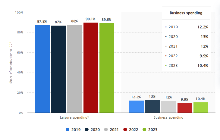 وأشارت البيانات إلى أن نحو 90% من إنفاق السائحين في مصر خلال 2023 كان موجهًا للسياحة الترفيهية، مقابل أكثر من 10% لسياحة الأعمال، ما يفتح المجال أمام تنمية هذا النمط مستقبلًا، وفقًا لبيانات Statista.