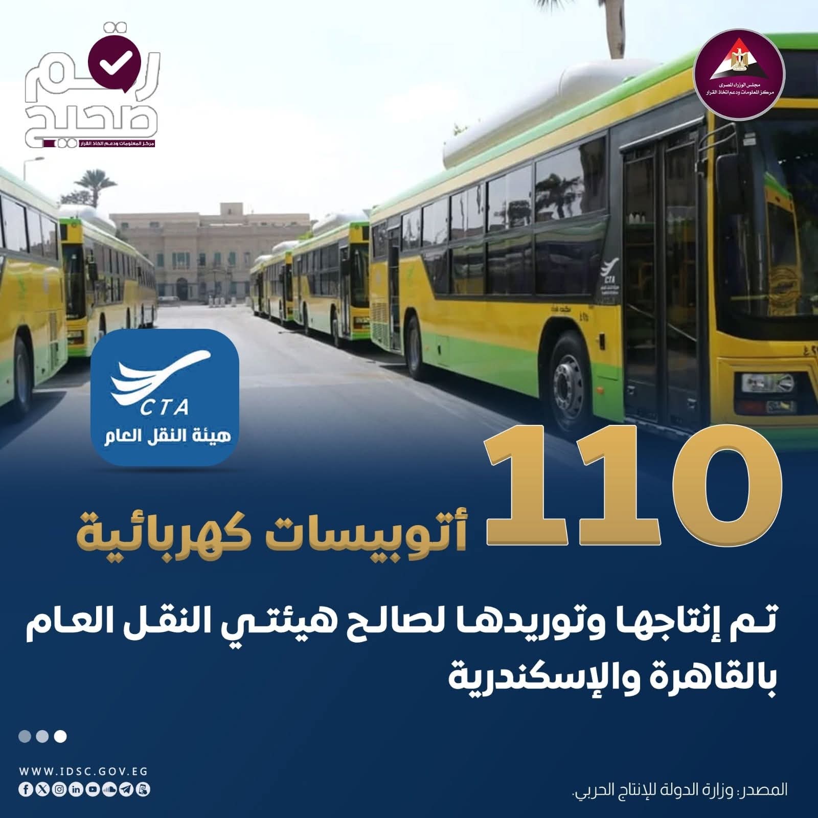وأكدت وزارة الدولة للإنتاج الحربي أن الأتوبيسات الكهربائية الجديدة تأتي ضمن توجه الدولة للتوسع في استخدام الطاقة النظيفة، بما يسهم في تقليل الانبعاثات الضارة والحفاظ على البيئة، إلى جانب تحسين مستوى الخدمات المقدمة للمواطنين في قطاع النقل العام.