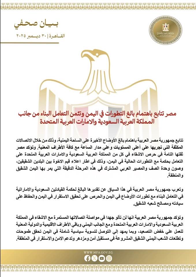 أصدرت وزارة الخارجية المصرية بيانًا أكدت فيه متابعتها المستمرة للأوضاع في اليمن، مشيرة إلى الاتصالات المكثفة التي تجريها على أعلى المستويات مع كافة الأطراف المعنية، بهدف متابعة الأحداث عن كثب والعمل على خفض التصعيد في المنطقة.