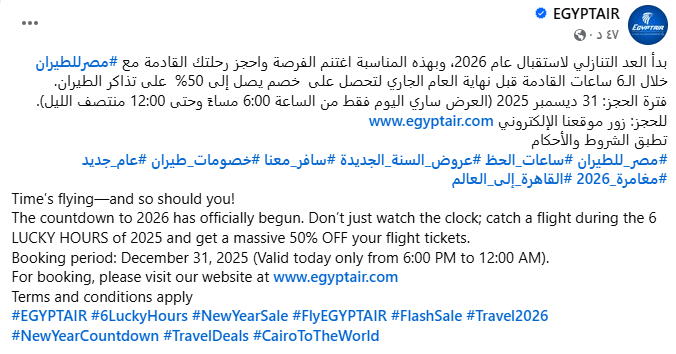 أعلنت الشركة الوطنية مصر للطيران، بدء العد التنازلي لاستقبال 2026، بطرح فرصة حجز للرحلات القادمة خلال 6 ساعات قبل نهاية العام الجاري.