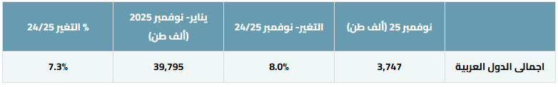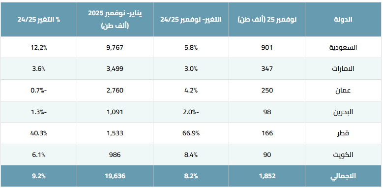 وعلى المستوى الشهري، وصل إنتاج شهر نوفمبر 2025 إلى 1.85 مليون طن بزيادة 8.2% على أساس سنوي، وتصدرت السعودية دول المنطقة بإنتاج بلغ 9.77 مليون طن (+12.2%)، مدعومة باستمرار المشاريع التنموية الكبرى.